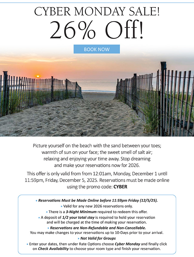 The Admiral On Baltimore would like to offer you this exclusive savings opportunity. We are again offering our loyal guests 26% off any NEW 2026 reservations.